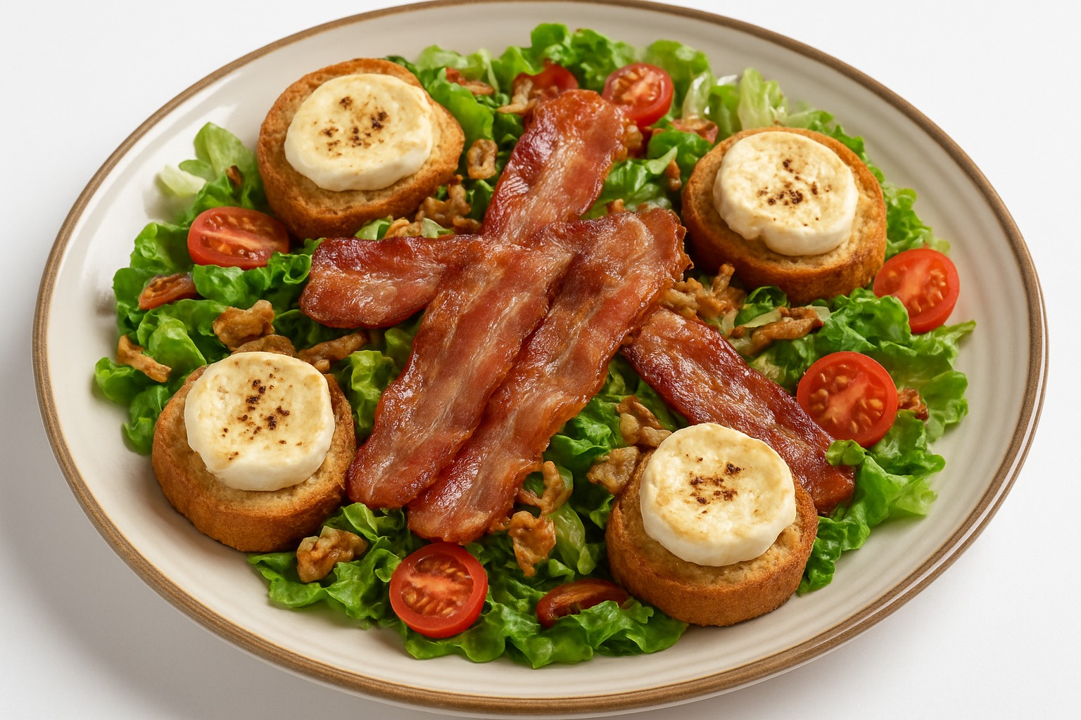 Salade verte, poulet pané (halal), œuf dur, tomates, copeaux de parmesan, croûtons, oignons - Plat : €16.50